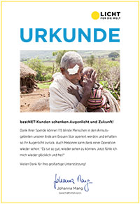 Dank dem Engagement unserer Kunden bei der bestNET.Weihnachtsaktion konnten wir € 3.450,- an Licht für die Welt überweisen. Damit können 115 Operationen am Grauen Star in den ärmsten Ländern der Welt finanziert werden.